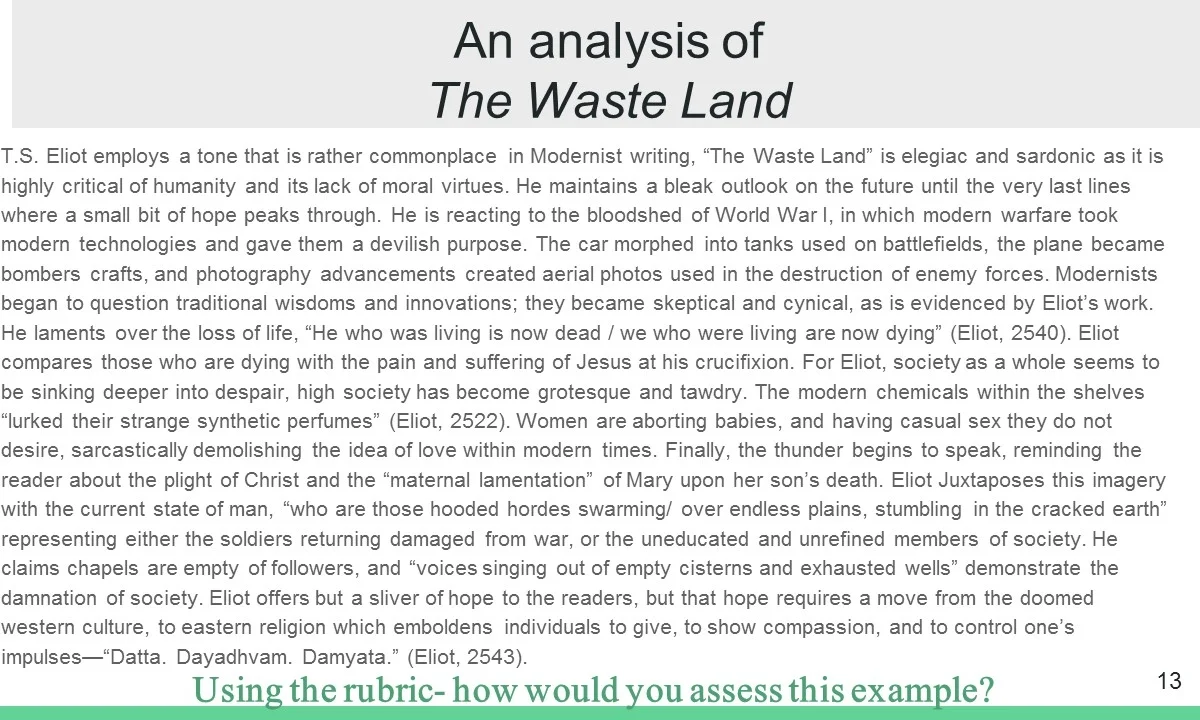 This is an example from my Literary Analysis unit. Students assess this literary analysis based on the rubric I have provided for them!
