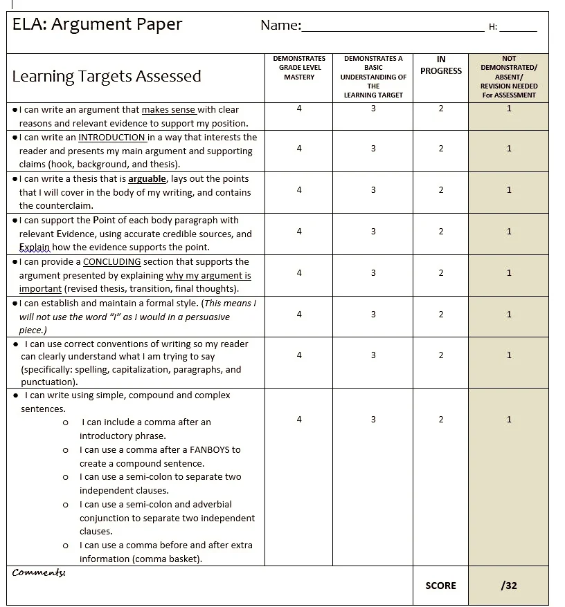 This does mean that I will offer different rubrics to different students on occasion. My ‘high fliers’ may be able to draft an argument that will knock your socks off, and they can do so with excellent grammar and punctuation. I will expect more from them and this will be reflected in their rubric. I will ask them to incorporate ethos/pathos/logos. I will ask them to avoid all logical fallacies. I will ask them to draft a counter-argument to refute even the strongest counterclaim. I will ask them to incorporate a variety of sentence structures and quality word choice. A struggling writer may look at this rubric and say “nope, not happening, quitting is better than failing.” Instead, I will ask them to build a quality PEE paragraph, attempt a counterclaim (with a graphic organizer for support) and to use proper punctuation in their compound sentences. Manageable expectations will help your struggling writers to feel success, and will, in-turn, build confidence.